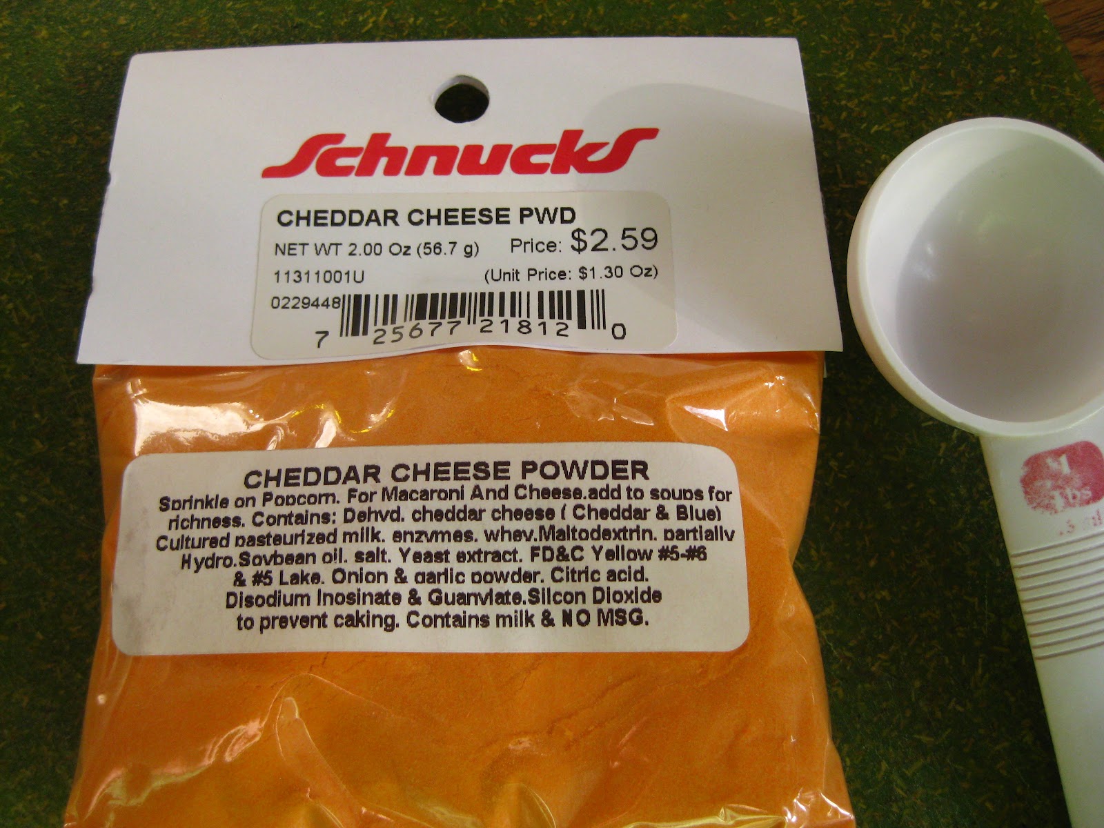 The first major success was that I found a packet of powdered cheese at the store. There is was, on a bulk spice rack, looking suspiciously like it had been liberated from a box of Kraft Mac n' Cheese. What can I say, it's the Midwest. It looks horrifying. The downside is that this was from the bulk spices and was distributed by my local grocery store. Is it available everywhere? I have no idea. It looks and tastes a LOT like the packet of cheese you get in a box of Mac n Cheese. Maybe that would be the alternative?